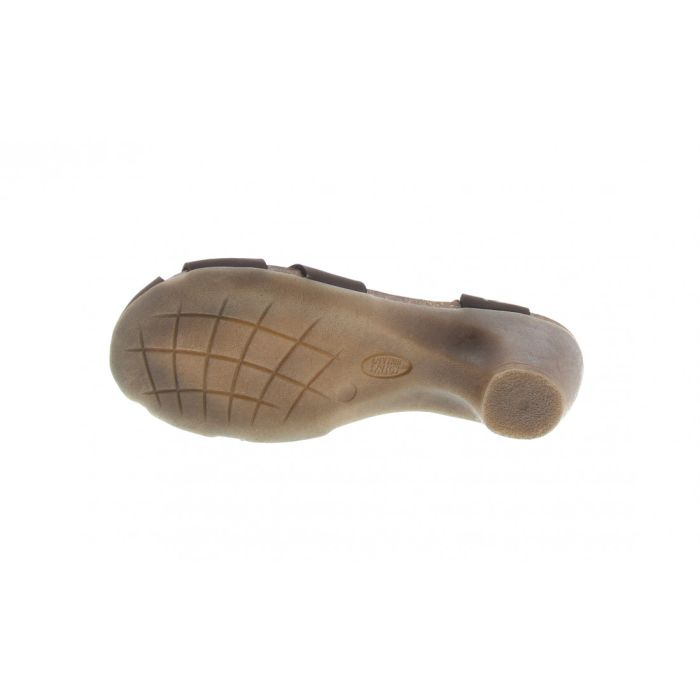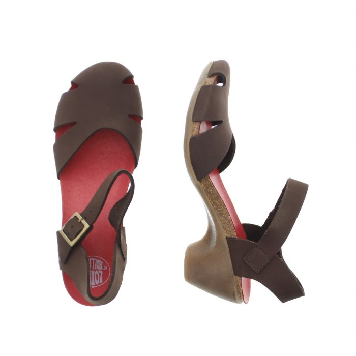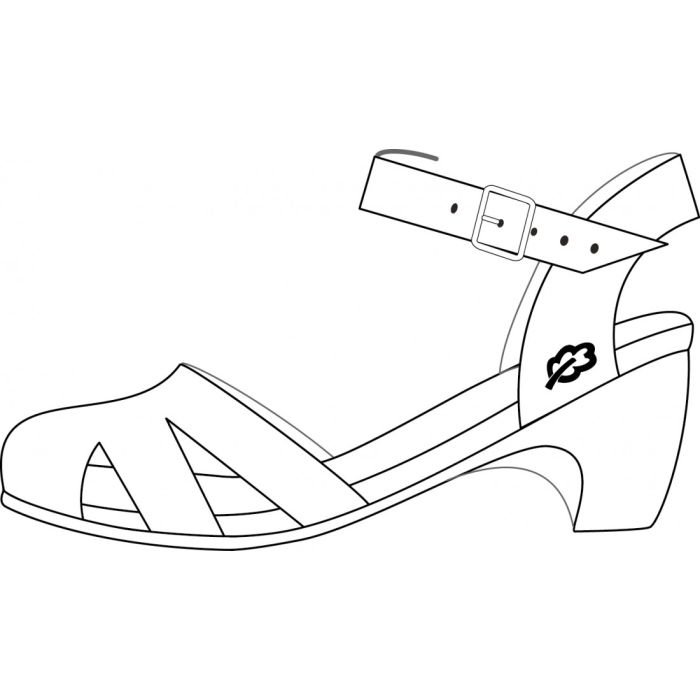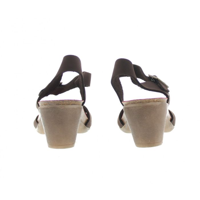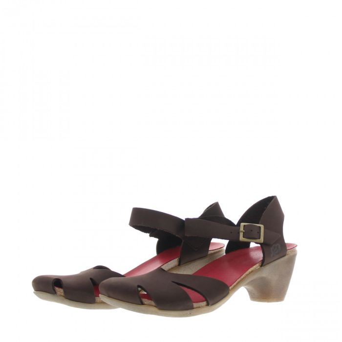 Notendaal is een comfortabele sandaal met hak, een verhullende maar halfopen neus voor ademend vermogen en een verstelbare gespsluiting rond de enkel.