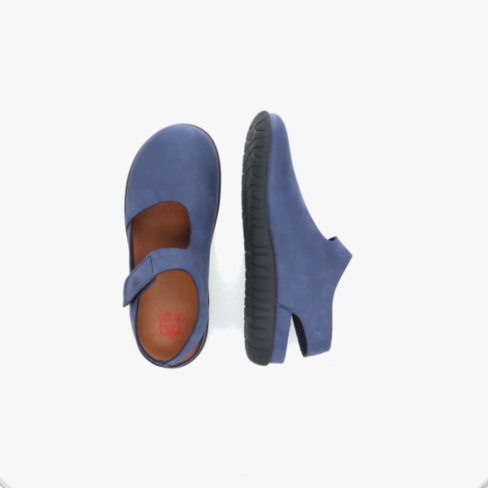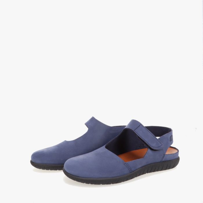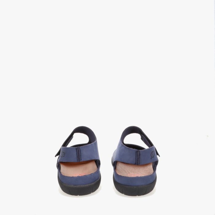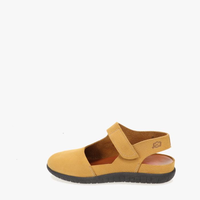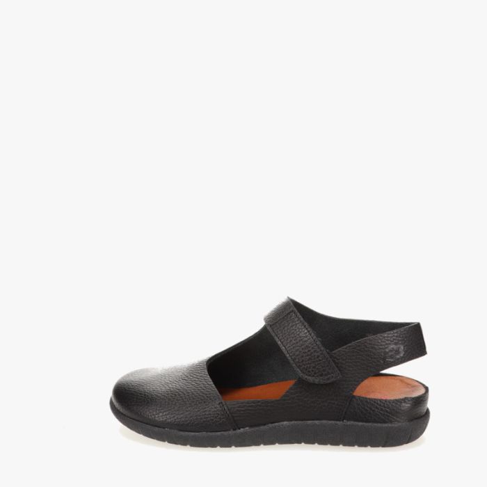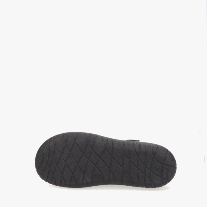 Dit is een gladde, platte sandaal met gesloten neus en verstelbare klittenbandsluiting rond de enkel.