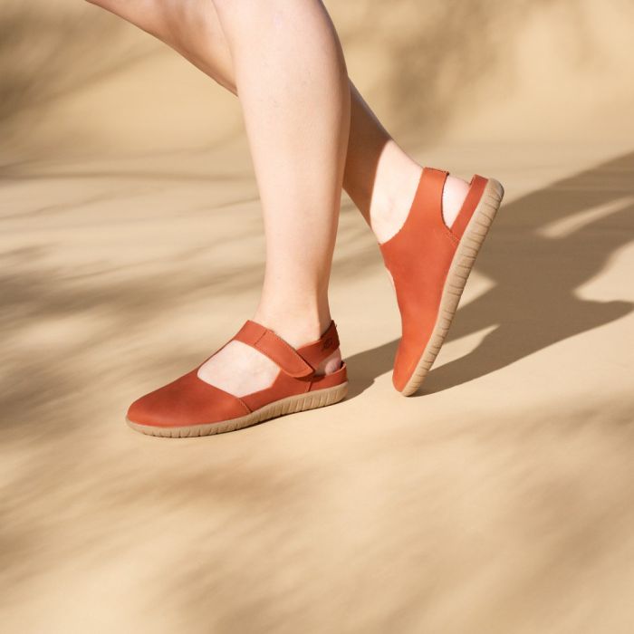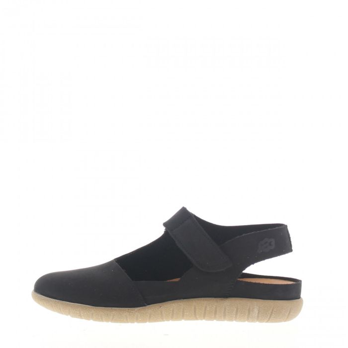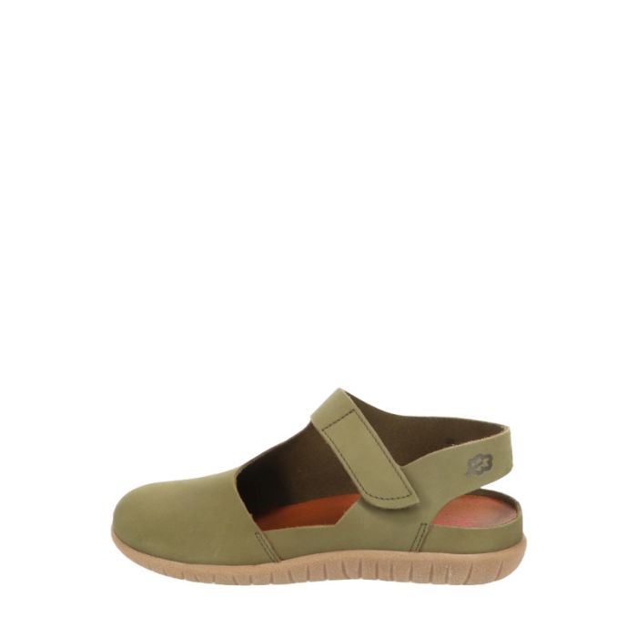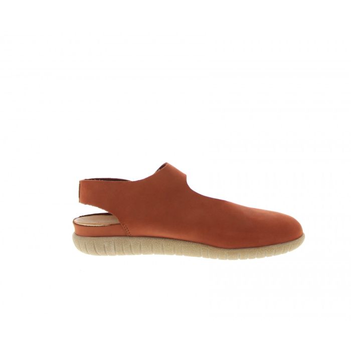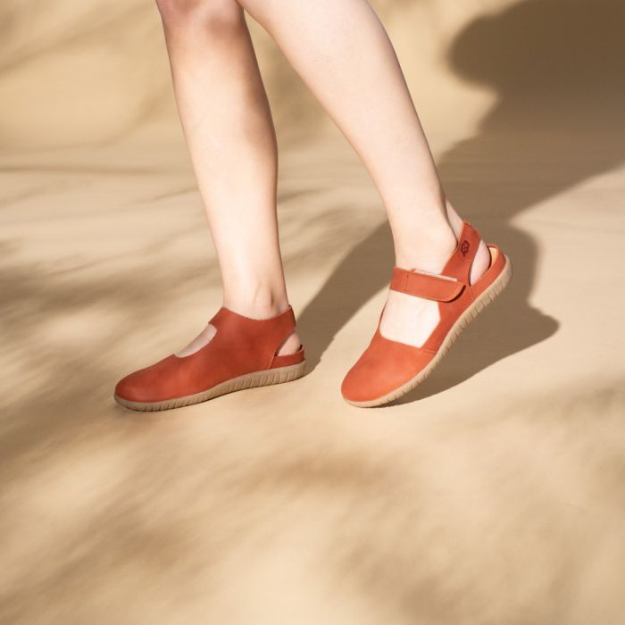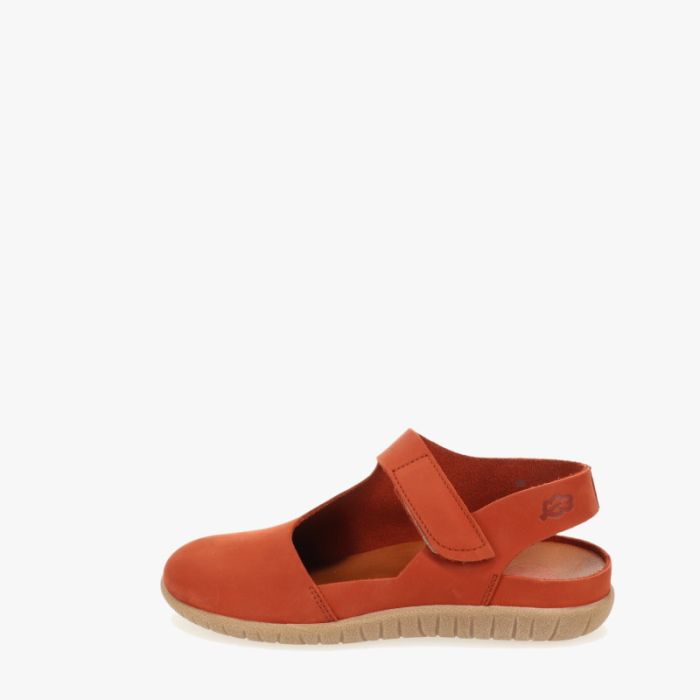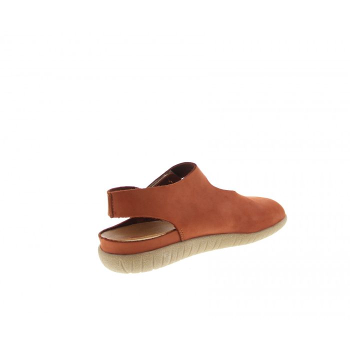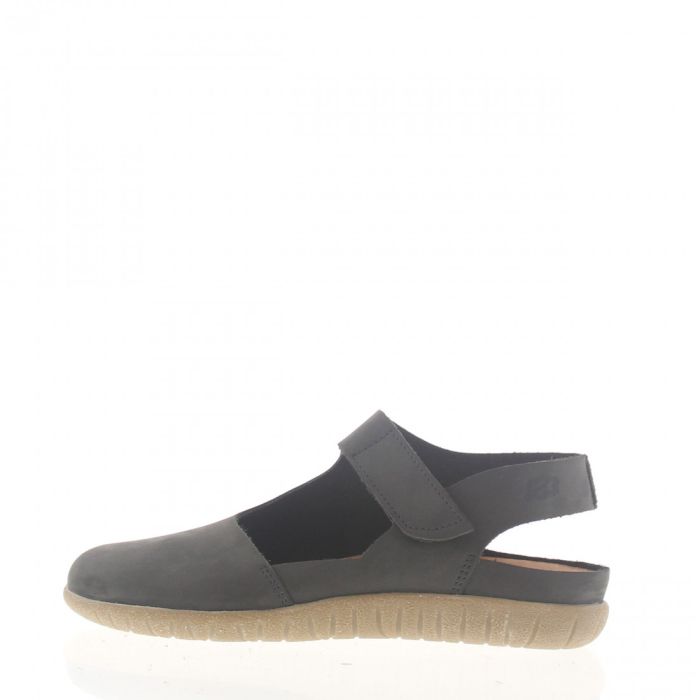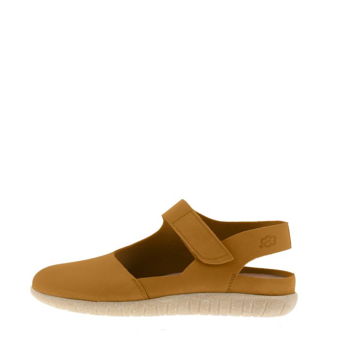 Biezelinge is een comfortabele, platte sandaal met een gesloten neus en een verstelbare klittenbandsluiting rond de enkel.