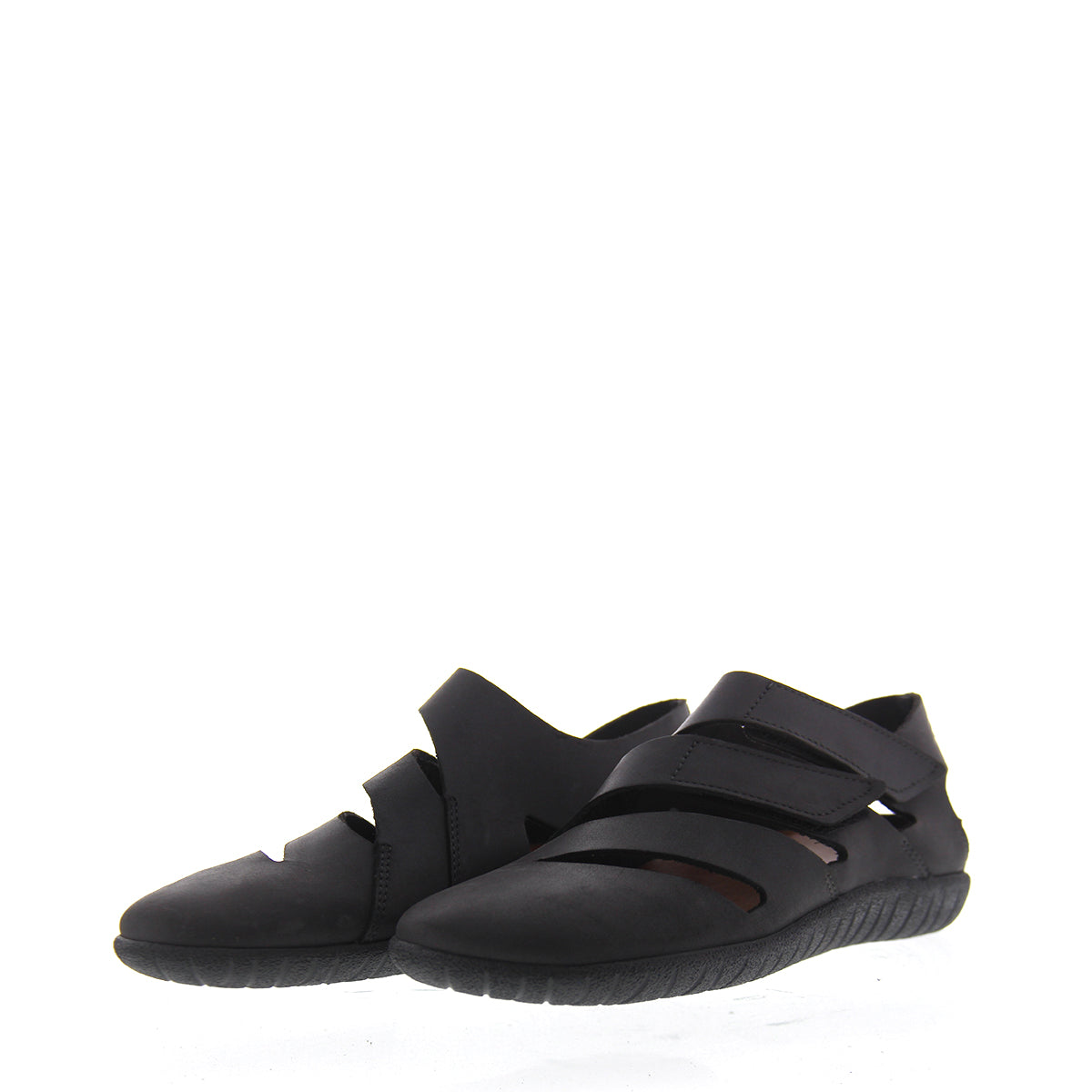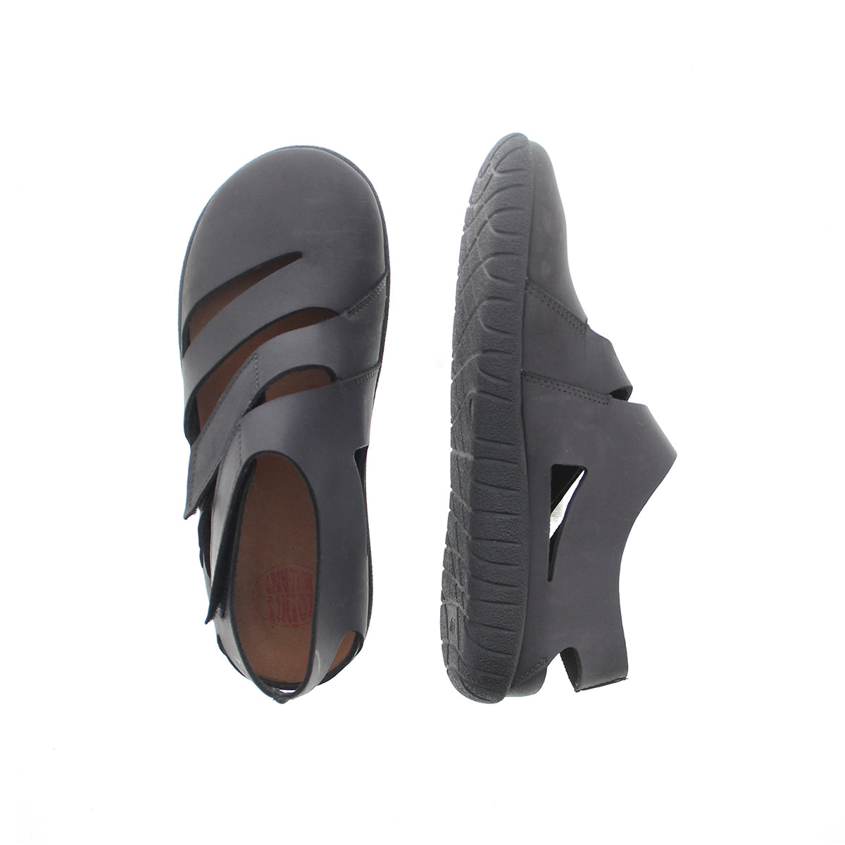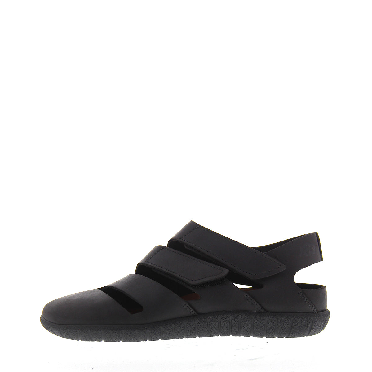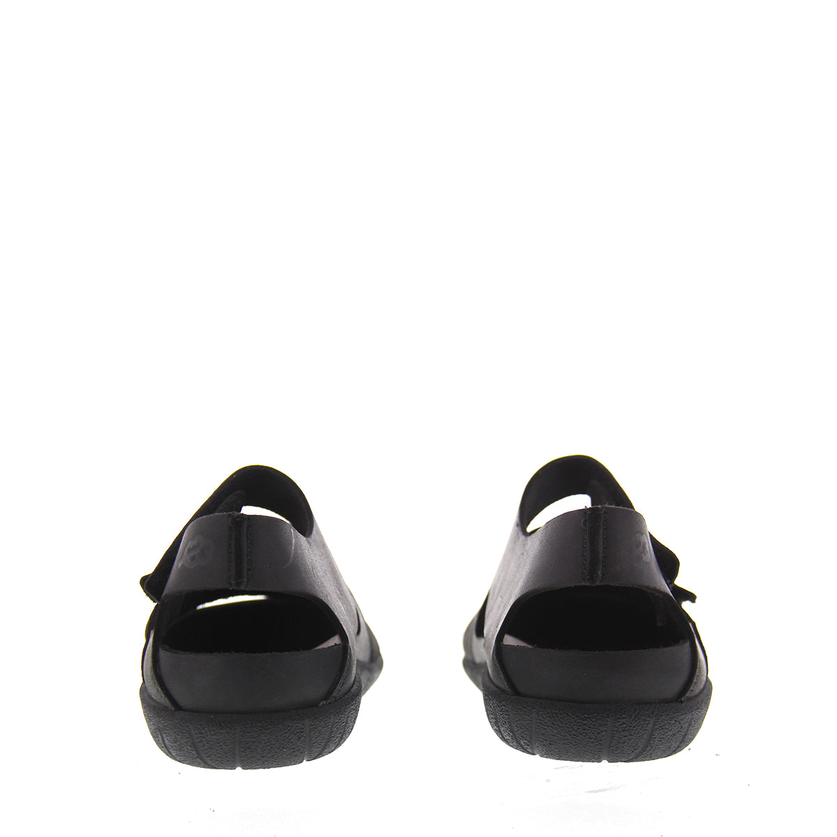 Dit is een gladde, platte sandaal met gesloten neus en verstelbare klittenbandsluiting rond de enkel.