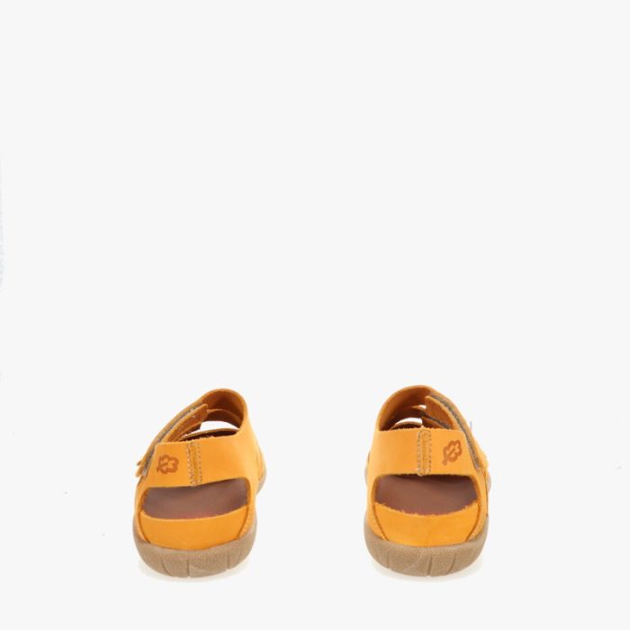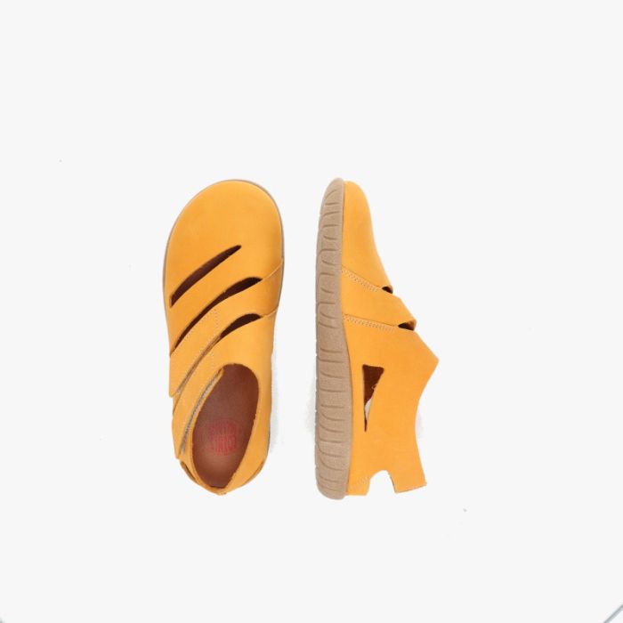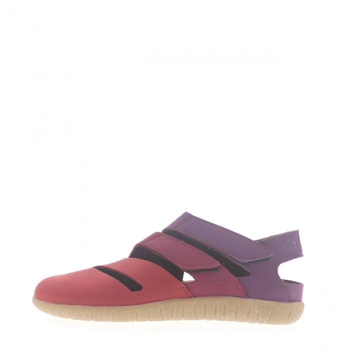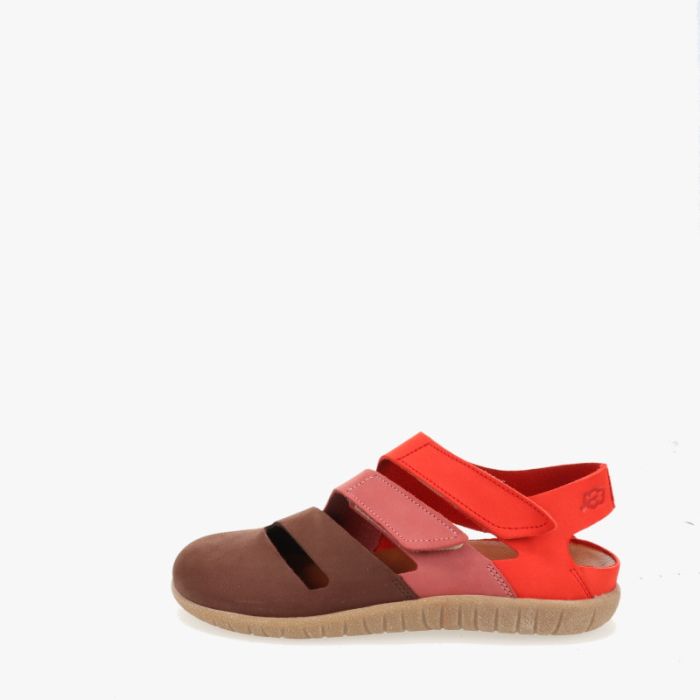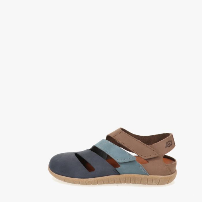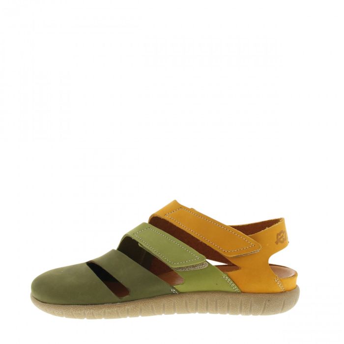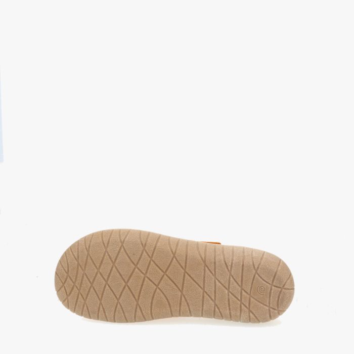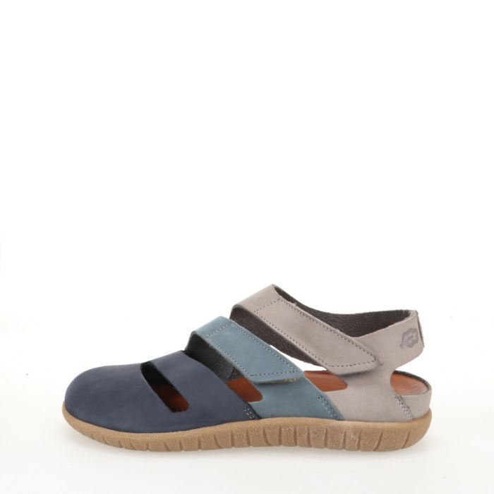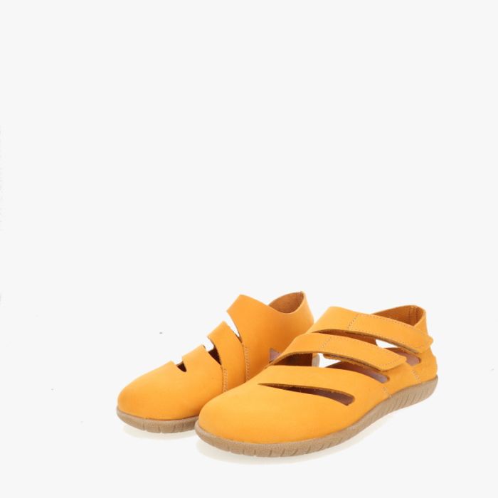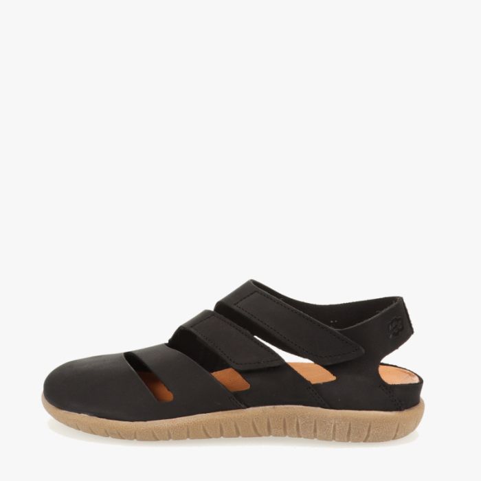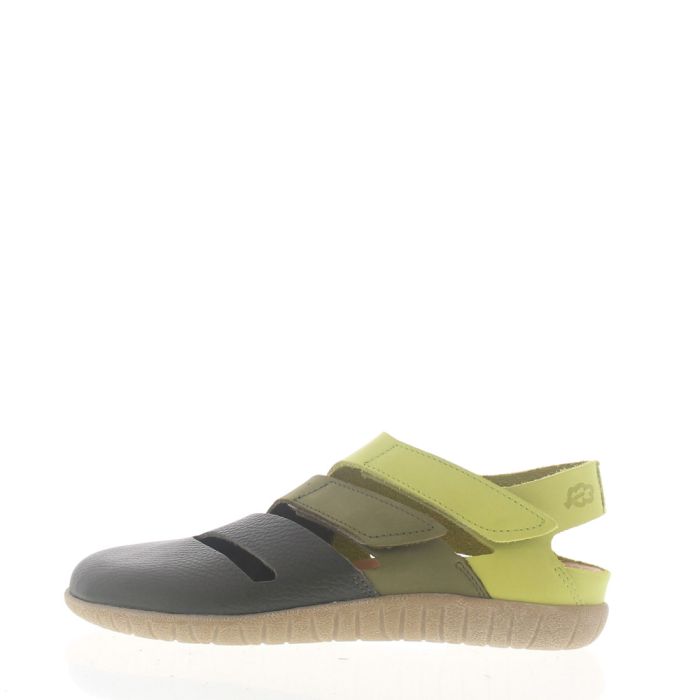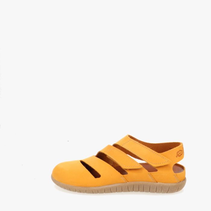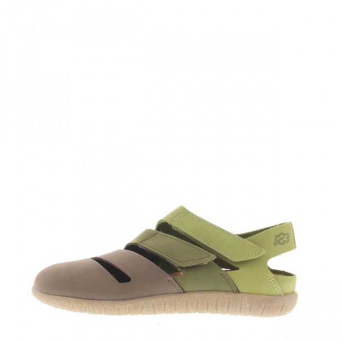 Beekkant is a comfortable, flat sandal with a closed nose, small slits on top of the foot and two adjustable straps.